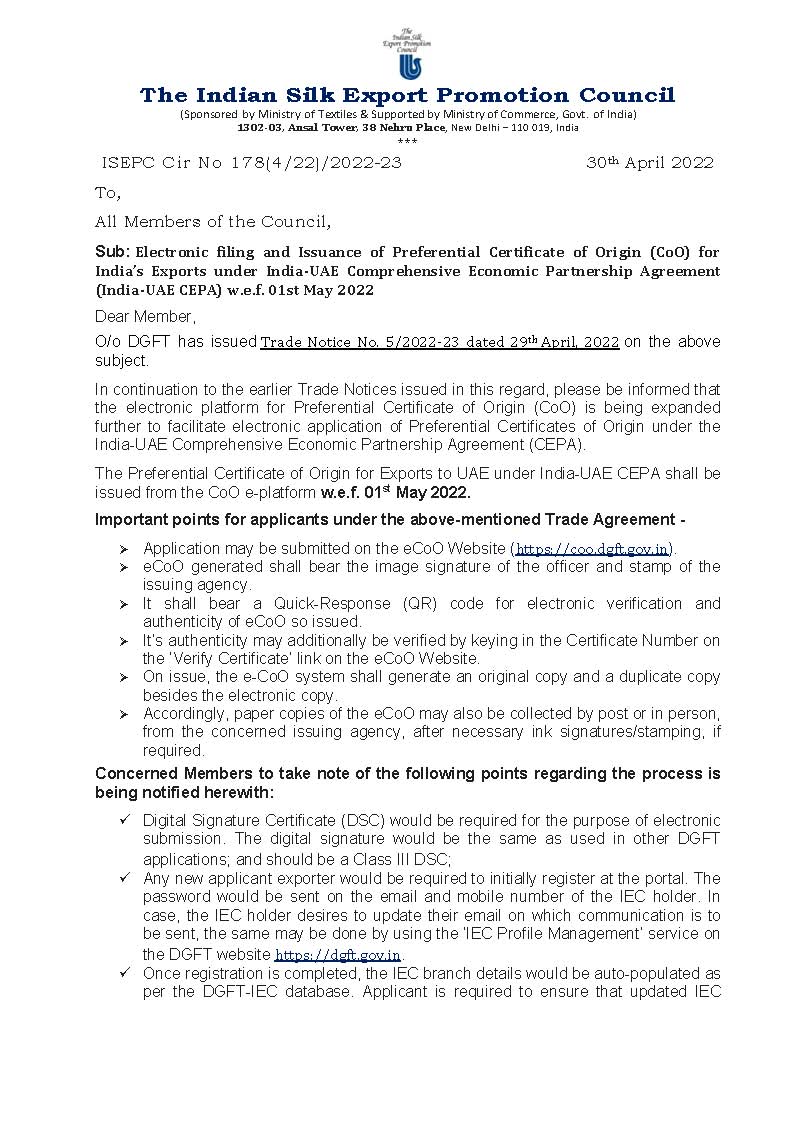Electronic filing and Issuance of Preferential Certificate of Origin (CoO) for India’s Exports under India-UAE Comprehensive Economic Partnership Agreement (India-UAE CEPA) w.e.f. 01st May 2022